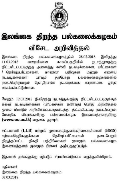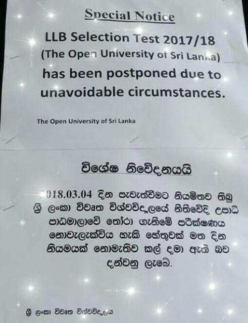 சட்டக்கல்லூரிக்கான (LLB), திறந்த பல்கலைக்கழக நுழைவுப் பரீட்சை மார்ச் 4 ஆம் திகதி இடம்பெறவுள்ளதாக அறிவிக்கப்பட்ட போதும் தவிர்க்க முடியாத காரணங்களால் பிற்போடப்பட்டுள்ளதாக இலங்கை திறந்த பல்கலைக்கழகம் அறிவித்துள்ளது.