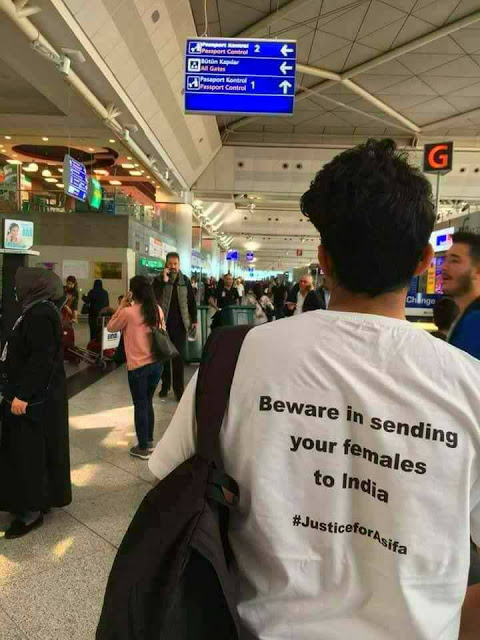 துருக்கி இஸ்தான்புல் விமான நிலையத்தில் சிலர் அணிந்திருந்த டீ ஷர்டுகளில் இந்தியாவுக்கு பெண்களை அனுப்புவதாக இருந்தால் கவனமாக இருங்கள் என்றும், இந்தியாவில் மாட்டிற்கு இருக்கும் மதிப்பு கூட பெண்களுக்கு இல்லை என்றும் டீ ஷர்ட் அணிந்திருந்தனர்.