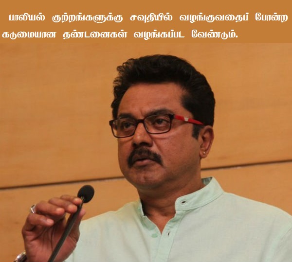 இதுகுறித்து சரத்குமார் புதுக்கோட்டையில் கூறுகையில் பாலியல் குற்றங்களுக்கு சவுதியில் வழங்குவதைப் போன்ற கடுமையான தண்டனைகள் வழங்கப்பட வேண்டும். அப்போதுதான் தப்பு செய்ய வேண்டும் என்று நினைக்கும்போதே பயம் வரும்.