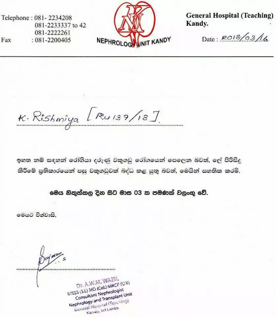 எனவே இலங்கையிலும் வெளிநாடுகளிலும் உள்ள எமது உறவுகள் தம்மால் முடிந்த அத்தனை உதவிகளையும் செய்து இந்த சகோதரியின் உயிரை காக்குமாறு அன்புடன் வேண்டுகிறோம்.