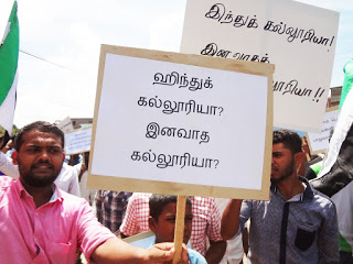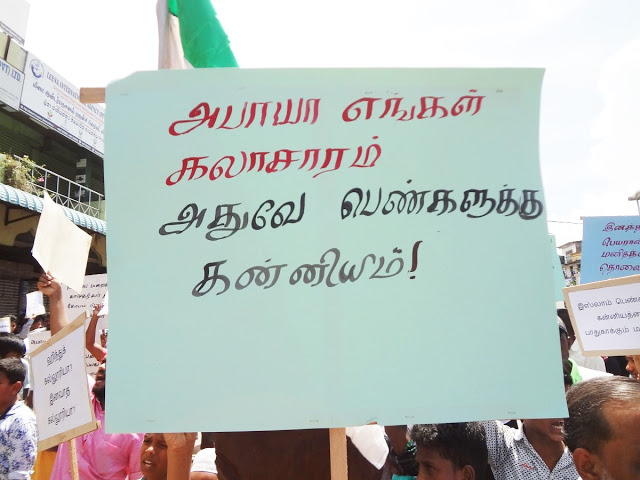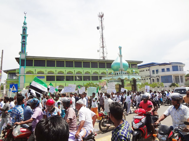ஜும்ஆ தொழுகையைத் தொடர்ந்து ஒன்றுதிரண்ட முஸ்லிம் ஆண்களும் பெண்களுமாக சண்முகா தேசியப்பாடசாலையின் அபாயா எதிர்ப்புக்கு எதிராய் கோஷங்களை எழுப்பியவாறு ஊர்வலமாய் சென்றனர்.