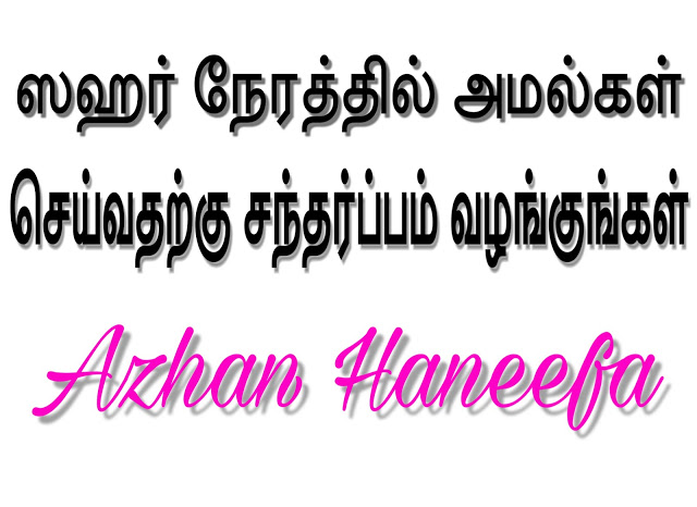 மக்களுக்கு இந்த ரமலானின் ஸஹர் நேரத்திலாவது அமல்கள் செய்ய சந்தர்ப்பம் வழங்குமாறு, ஸஹர் நேரத்தில் நிகழ்ச்சிகளை நிகழ்த்தும் குறிப்பாக உபதேசம் புரியும் அனைத்து ஆலிம்களிடமும் வினயமாக வேண்டுகிறேன்.