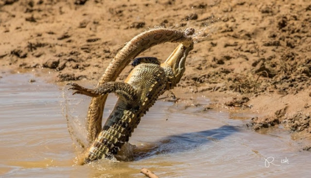 முதலையும் பாரிய பாம்பும் மோதிக்கொள்ளும் காட்சியே இவ்வாறு பதிவாகியுள்ளது.