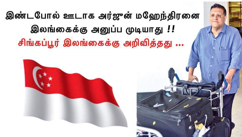 சிங்கப்பூர் நாட்டு சட்டதிட்டங்களுக்கு அமைவாக சர்வதேச பொலிஸ் பிடையாணைக்கு அமைவாக அந்த நாட்டு பிரஜை ஒருவரை கைது செய்து வேறு நாட்டிற்கு அனுப்ப முடியாது என சிங்கப்பூர் அரசு இலங்கைக்கு அறிவித்துள்ளதாகவும்,ராஜதந்திர முறையில் அர்ஜுன மஹேந்திரனை இலங்கைக்கு வரவழைக்க நடவடிக்கை முன்னெடுக்கப்பட்டுள்ளதாக குற்றப்புலனாய்வு திணைக்களம் சார்பில் அரச தரப்பில் ஆஜரான ஜனாதிபதி சட்டத்தரணி நீதி மன்றத்தில் தெரிவித்தார்.